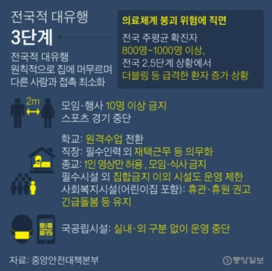 사회적 거리두기 5단계 기준중 가장 최악의 상황인 3단계는 전국적 대유행으로 원칙적으로 집에 머무르도록 하며 다른 사람과의 접촉을 최소화 해야 합니다.