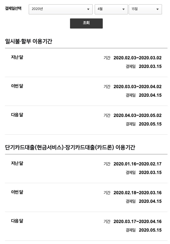 4월 15일이 결제일인 경우에는 지난달 3일부터 이번달 2일까지 사용된 금액이 결제금액입니다.