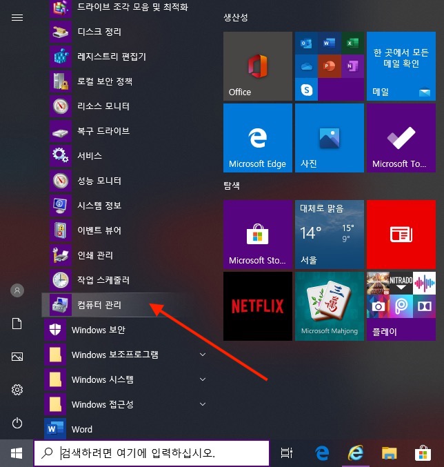 시작버튼 클릭후 'Windows 관리도구' -> '컴퓨터 관리' 앱을 클릭합니다.