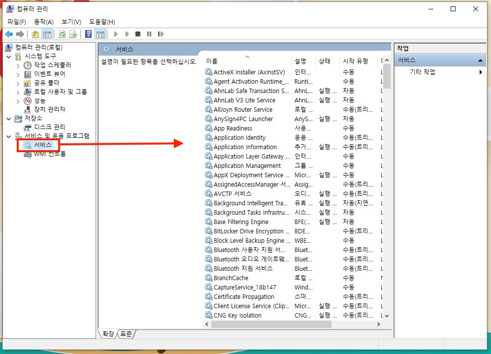 다음과 같이 컴퓨터 관리 앱이 열리면 오른쪽 하단에 있는 서비스 아이콘을 클릭합니다.